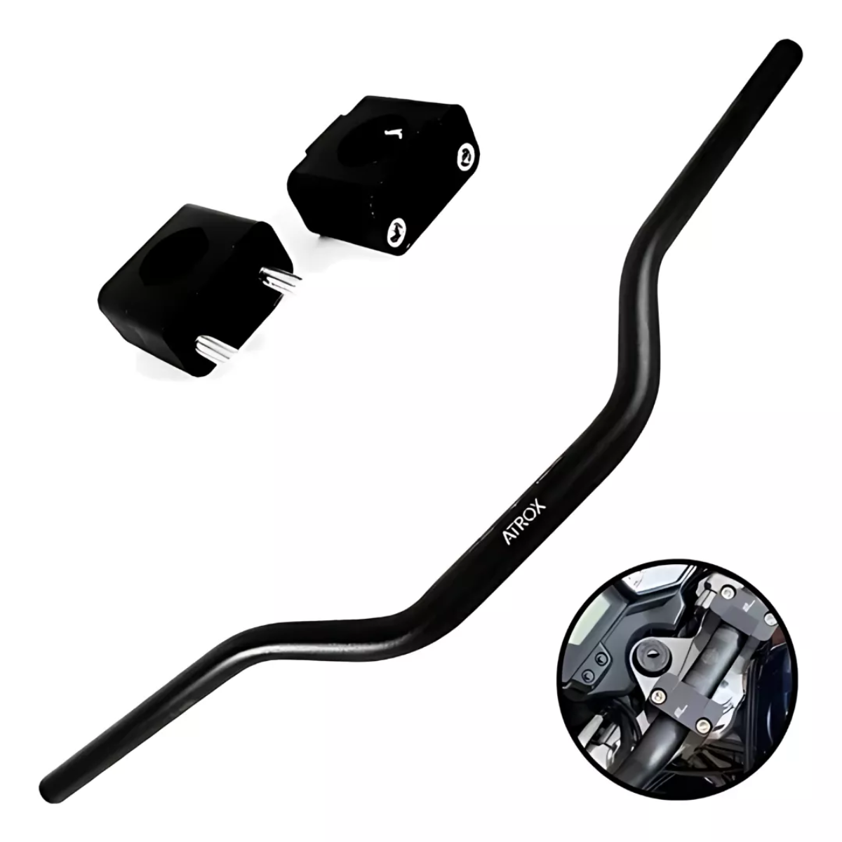 Guidão esportivo alto estilo Naked com acabamento preto fosco, ideal para quem busca performance, estilo e conforto na pilotagem.